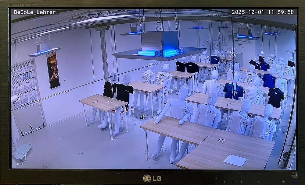 | Die Fotografie zeigt das Bild einer Überwachungskamera, die einen experimentellen Klassenraum-Versuchsaufbau im Rahmen des Forschungsprojekts „BeCoLe“ dokumentiert. Unter kontrollierten Innenraumbedingungen werden in diesem Realraum UVC-Luftentkeimungstechnologien getestet. Durch die gezielte Anwendung der UVC-Technologie sollen Möglichkeiten für einen sicheren und effizienten Einsatz in Schulen und medizinischen Einrichtungen erforscht werden.
