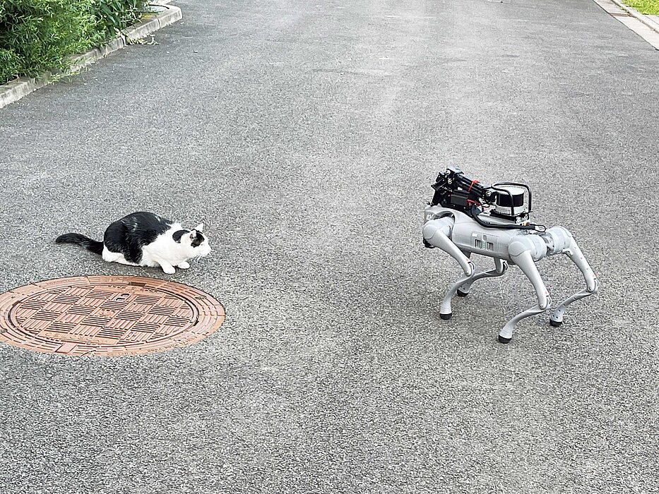 | Während der Erprobung und sozusagen bei den ersten Laufversuchen des neu beschafften Roboterhundes am Abend vor der Langen Nacht der Wissenschaft kam es zu einer interessanten Begegnung mit einer (analogen) Katze. Sie beschnüffelte den robotischen Vierbeiner hinter dem Nieperbau circa fünf Minuten lang.