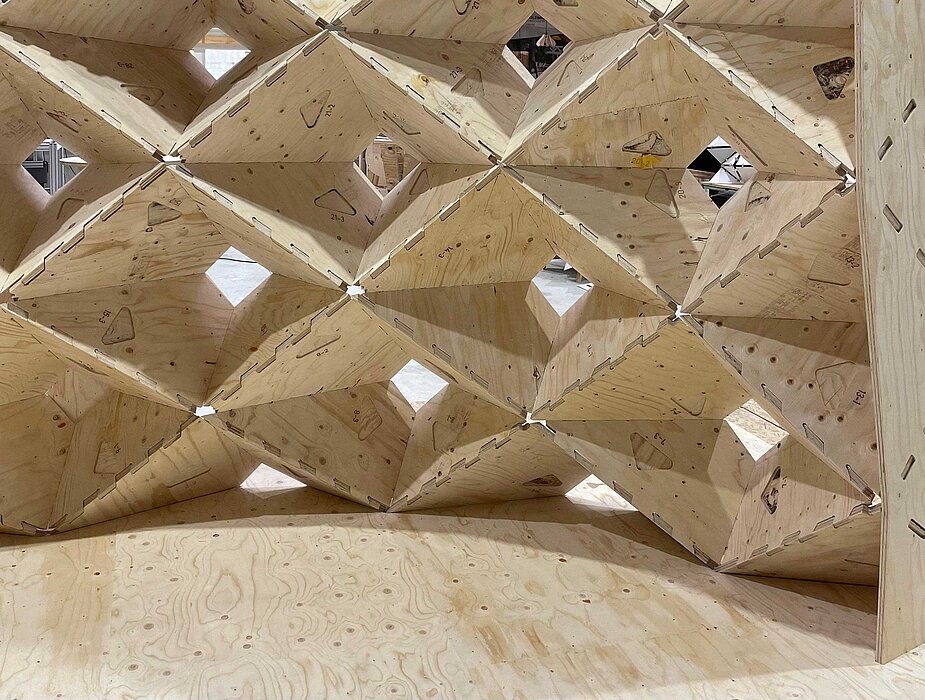 | Das Foto zeigt die robotisch gefertigte Trennwand PineWall, die im Seminar Digital Architectural Manufacturing gemeinsam mit Studierenden des Studiengangs Architektur an der HTWK Leipzig entstand. Die Konstruktion zeichnet sich durch eine fast vollständig digitale Prozesskette aus, vom parametrischen Entwurf bis zur automatisierten Fertigung. Besonderes Merkmal ist der monomaterielle Aufbau aus Holz, der ganz ohne metallische Verbindungsmittel auskommt.