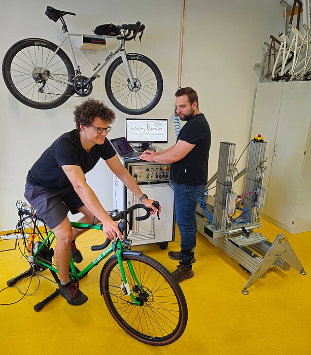 Nach Ermittlung der Lasten im realen Fahrbetrieb können diese im rechts sichtbaren Prüfstand nachgefahren werden, um die Lebensdauer von Rahmen und Anbauteilen zu ermitteln und mit Simulationsergebnissen abzugleichen. Dadurch können Fahrräder entwickelt werden, die nicht nur leichter, sondern vor allem sicherer sind.