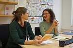 | Wissenschaft ist Teamwork. Zu ihrem Wesen gehört der fachliche Austausch über Ideen, Methoden und Ergebnisse. Die intensive Kommunikation unter Forschenden, wie hier im Projekt „SieWo – Sie wohnt gewaltfrei“ der interdisziplinären Forschungsstelle HOME, belebt nicht nur den Forschungsalltag. Sie ist unerlässlich, damit Erkenntnisse in gesellschaftlich relevantes Handeln münden. Im Bild führen die wissenschaftlichen Mitarbeiterinnen Dr. Friederike Frieler und Selma Matzberger einen Pre-Test eines Interview-Leitfadens durch.